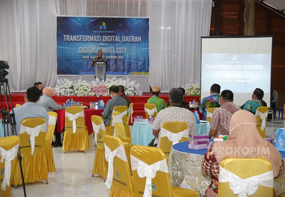 MAHAKAM ULU – Bupati Mahakam Ulu Bonifasius Belawan Geh, SH., ME yang diwakilkan Asisten Perekonomian dan Pembangunan (asisten II) E Tek Hen Yohanes, S.Pd membuka Acara Sosialisasi Transformasi Digital Daerah Menuju Digital Smart City di Mahulu, Kamis (27/01/22).