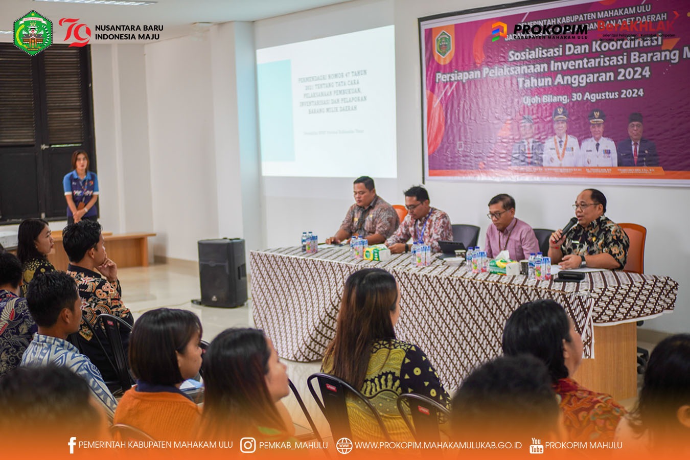 Sosialisasi ini menghadirkan narasumber dari Tim BPKP Perwakilan Provinsi Kaltim, sebagai Koordinator Pengawas Kelompok, Auditor Bidang Akuntabilitas Pemerintah Daerah Rober Gatot Megantoro, Ak., M.M., Ahli Muda Pertama Taufik Wijaya, Auditor Terampil Ali Irfansyah, A.Md., Ak., Indah Nuraisyah Mimi Usman Auditor Terampil dan seluruh Operator Bendahara Barang (Prokopim/aim).