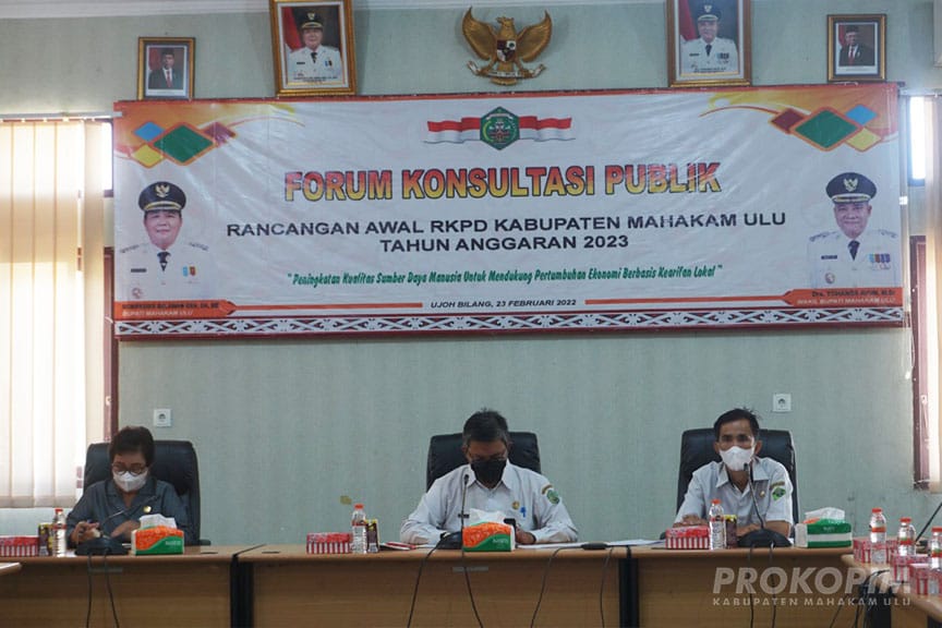 UJOH BILANG – Dalam Rangka Sosialisasi Prioritas dan Sasaran Pembangunan Tahun 2023 guna mendapat masukan dan penyempurnaan dalam Penetapan Prioritas dan Sasaran Rencana Kerja Pemerintah Daerah (RKPD) Kabupaten Mahakam Ulu Tahun 2023, Badan Perencanaan Pembangunan Penelitian dan Pengembangan Daerah (BP4D) Kabupaten Mahakam Ulu (Mahulu) menggelar Forum Konsultasi Publik Rancangan Rencana Kerja Pemerintah Daerah (RKPD) Tahun 2023, di Ruang Rapat Bappelitbangda. Rabu (23/02/22)