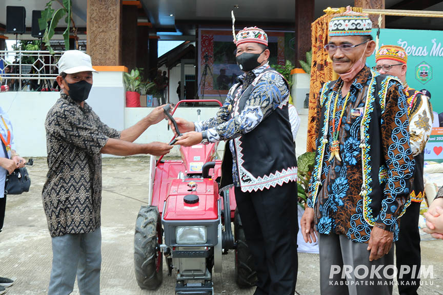 Acara Launching Produksi Beras Lokal Hasil Panen Tahun 2022 akhirnya ditutup dengan Penyerahan Bantuan Alat Mesin Pertanian Berupa Hand Traktor Oleh Bupati Mahulu Bonifasius Belawan GeH,SH.,ME kepada Gabungan Kelompok, dan dilanjutkan dengan Peninjauan Lokasi Stand Pameran. Kemudian, disamping acara Launching Produksi Beras Lokal Hasil Panen Tahun 2022, Adapun Penyerahan Secara Simbolis Qris Code Bank Kaltimtara yang diberikan Oleh Pimpinan Cabang Bank Kaltimtara Faisal Riza kepada BUMK Pekalai Murip Kampung Laham.
