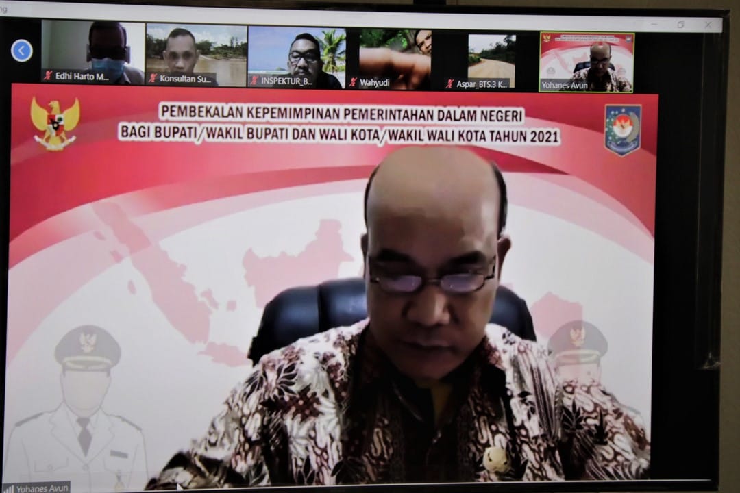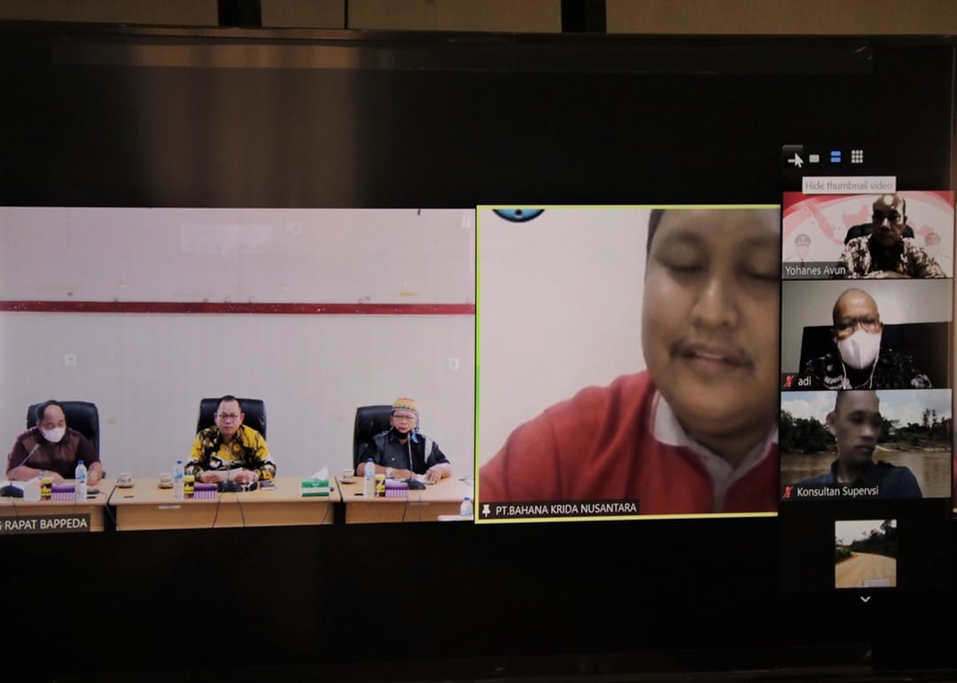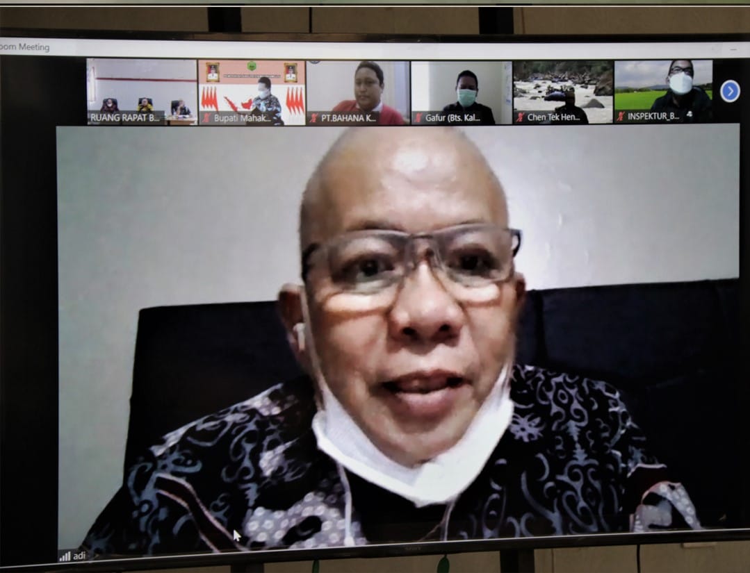 Bupati Mahulu Bonifasius Belawan Geh, SH., M.E pada saat memimpin Rapat Koordinasi Pembangunan Jembatan Sungai Ratah secara virtual.
