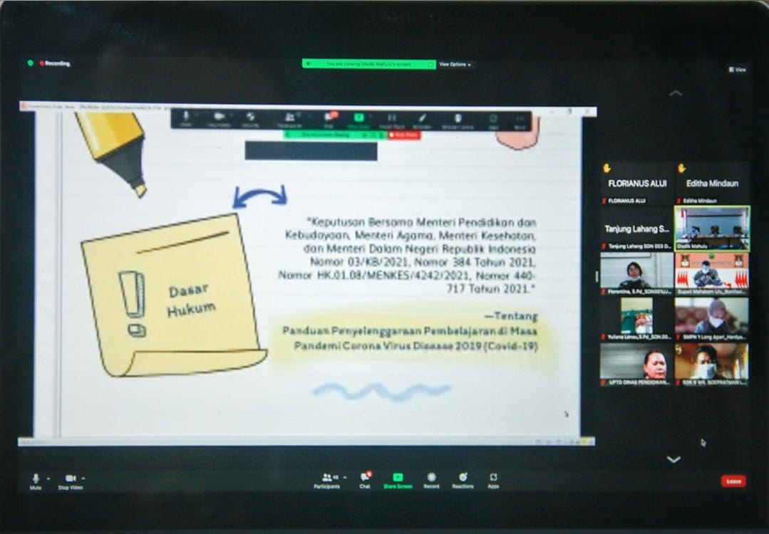 Rakor yang dipimpin langsung oleh Bupati Mahakam Ulu (Mahulu) Bonifasius Belawan Geh,SH.,ME yang diikuti secara Virtual, dihadiri pula oleh Sekretaris Daerah Mahulu Dr. Stephanus Madang, S.Sos MM, Kepala Dinas Kesehatan P2KB Drg. Agustinus Teguh Santoso, M.Adm.Kes; Kadis Disdikbud yang di wakili Kabid Pendidikan Dasar, Menengah Pertama dan Pembinaan Ketenagaan Bungai, SE; serta hadir pula Kepala Sekolah Se-Kabupaten Mahulu.