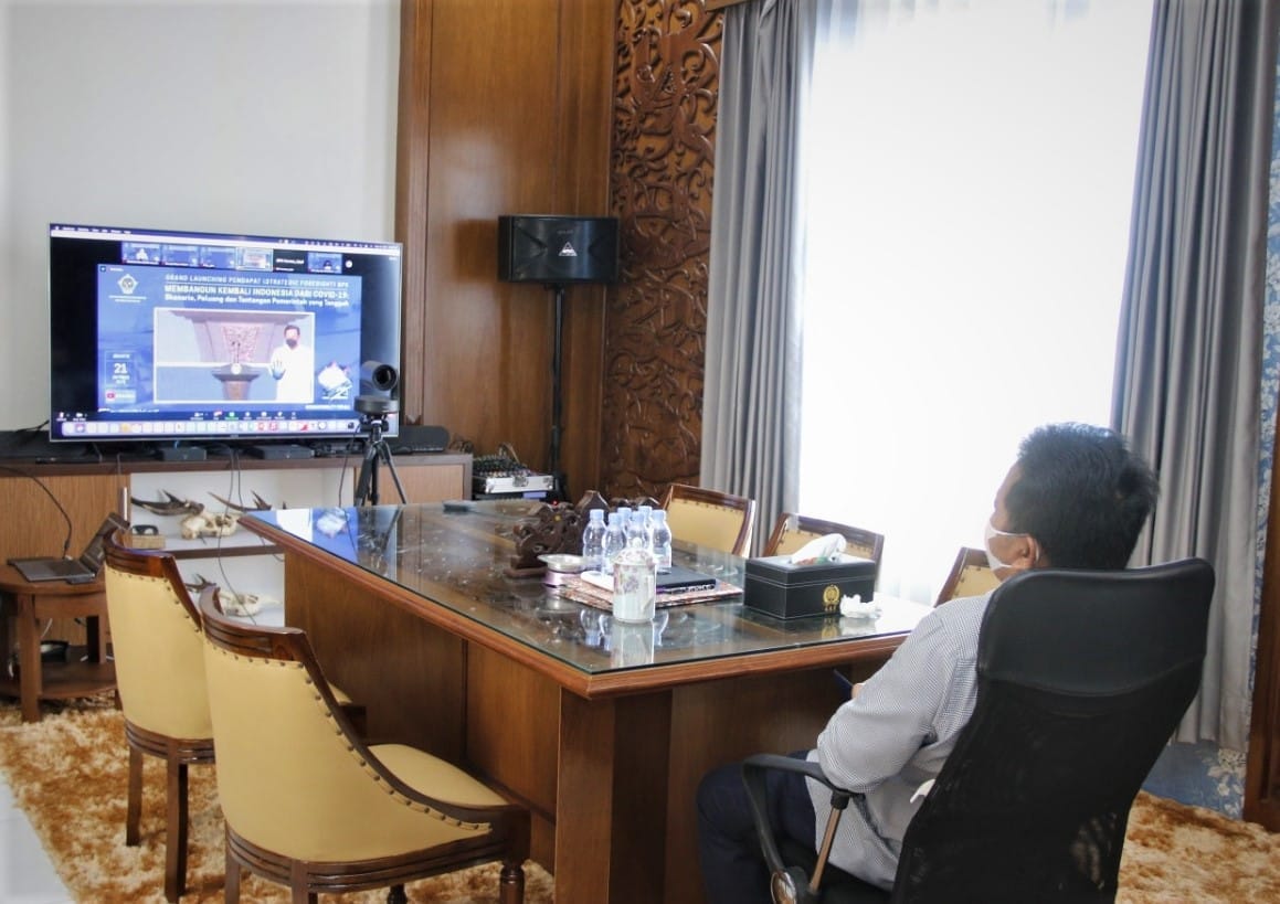 UJOH BILANG – Bupati Mahakam Ulu (Mahulu) Bonifasius Belawan Geh,SH,ME mengikuti Grand Launching Buku Pendapat ( Strategic Foresight) Badan Pemeriksa Keuangan (BPK) Republik Indonesia (RI) secara virtual di rumah jabatan. Kamis (21/10/21)