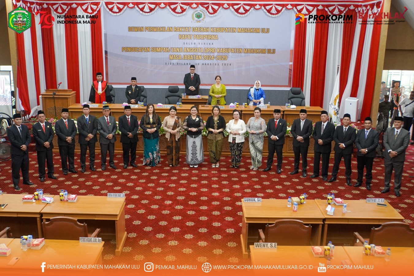 Pengucapan Sumpah/Janji Anggota DPRD Kabupaten Mahulu Masa Jabatan 2024 – 2029 dilakukan oleh Wakil Ketua Pengadilan Negeri Kutai Barat Achmad Wahyu Utomo, S.H., M.H. dan disaksikan oleh seluruh tamu undangan yang hadir.