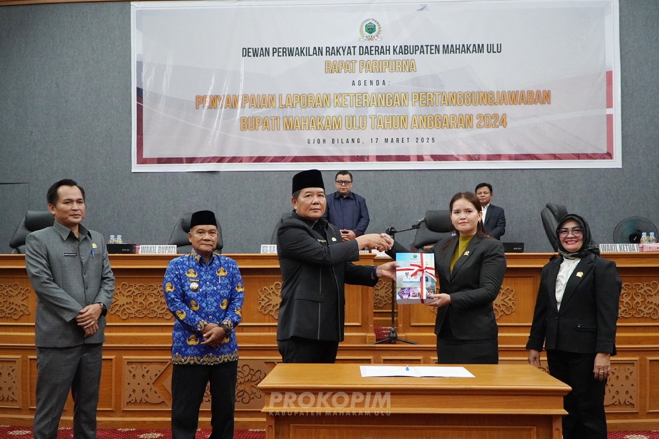 Ujoh Bilang – Bupati Mahakam Ulu (Mahulu) Dr. Bonifasius Belawan Geh, S.H., M.E., didampingi Wakil Bupati Mahulu Drs.Yohanes Avun, M.Si., menyampaikan Laporan Keterangan Pertanggungjawaban (LKPJ) Bupati Mahulu Tahun Anggaran 2024 dalam Rapat Paripurna Dewan Perwakilan Raykat Daerah (DPRD) Mahulu,di Ruang Rapat Paripurna Lt.2 Kantor DPRD Mahulu. Senin (17/03/25)