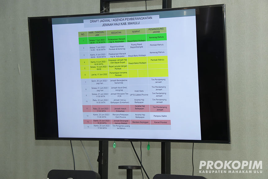 Rakor dipimpin langsung oleh Kepala Kantor Kementerian Agama Kab. Mahakam Ulu Longginus, S.S, mewakili Pemkab Mahulu dihadiri oleh Asisten I Bidang Pemerintahan dan Kesra drg. Agustinus Teguh Santoso, M.Adm,Kes, Staf Ahli bidang Pemerintahan dan Kesra Ir. Dodit Agus Riyono,.MP. Perwakilan Kepala Dinas Kesehatan, Kabid Pengendalian Penduduk & Keluarga Berencana dr. Petronela Tugan, M.Kes serta para peserta jemaah haji Kabupaten Mahulu.