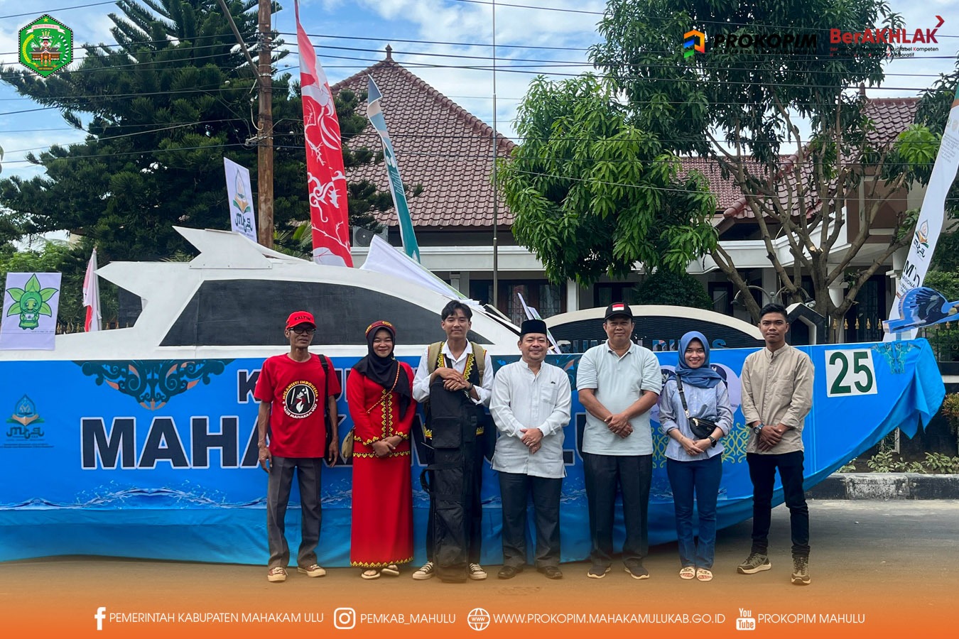 Replika speedboat yang dibawakan Mahulu, menggambarkan alat transportasi utama di Mahulu, mengingat kondisi jalan darat yang masih terbatas. Pada kendaraan hias ini juga menampilkan alat musik Sapeq khas Dayak yang diiringi lagu-lagu religi Islami, sebagai bentuk kolaborasi budaya lokal dan religi. (Prokopim/tha)