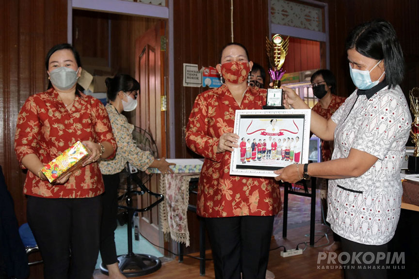 UJOH BILANG – Ketua Dharma Wanita Persatuan (DWP) Kabupaten Mahakam Ulu (Mahulu) Marite Devung Madang, S.Kep Ners menyerahkan Hadiah Bagi Pemenang Lomba Busana Kebaya dalam rangka memperingati Hari Kartini ke 143 tahun 2022.
