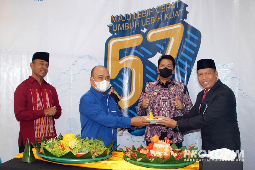 Dalam perayaan HUT PT. BPD Kaltimtara Bupati Mahulu dan Wakil Bupati Mahulu, secara bergantian memotong tumpang, dan menyerahkan kepada Pimpinan PT. BPD Kaltimtara Cabang Ujoh Bilang Faisal Riza, sebagai tanda syukur HUT PT. BPD Kaltimtara ke 57 Tahun.(Prokopim/aim/td)