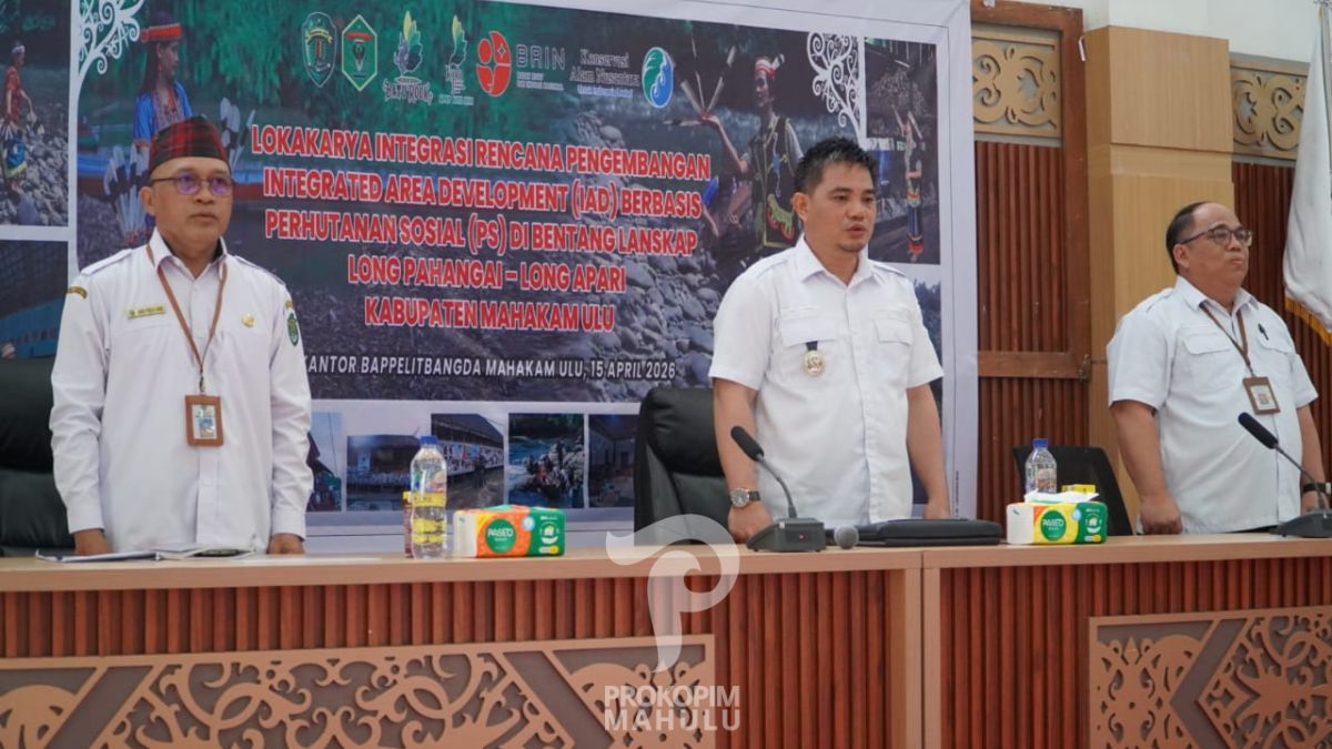 UJOH BILANG – Mewakili Bupati Mahakam Ulu (Mahulu), Angela Idang Belawan, Wakil Bupati Mahulu, Suhuk, S.E., secara resmi membuka Lokakarya Integrasi Rencana Pengembangan Integrated Area Development (IAD) Berbasis Perhutanan Sosial (PS) di Bentang Lanskap Long Pahangai–Long Apari sebagai upaya mendorong kesejahteraan masyarakat melalui pengelolaan kawasan berkelanjutan, di Ballroom Lantai III Kantor Bupati Mahulu, Rabu (15/04/2026).