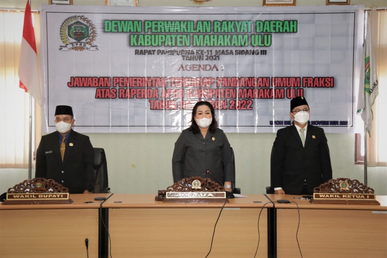 Bupati Mahakam Ulu (Mahulu) Bonifasius Belawan Geh, SH., M.E yang diwakili oleh Wakil Bupati Mahulu Drs. Yohanes Avun, M.Si menyampaikan Jawaban Pemerintah, terhadap Pemandangan Umum (PU) Fraksi atas Nota Pengantar Rancangan Peraturan Daerah (Raperda) Anggaran Pendapatan Belanja Daerah (APBD) Kabupaten Mahulu Tahun Anggaran 2022.
