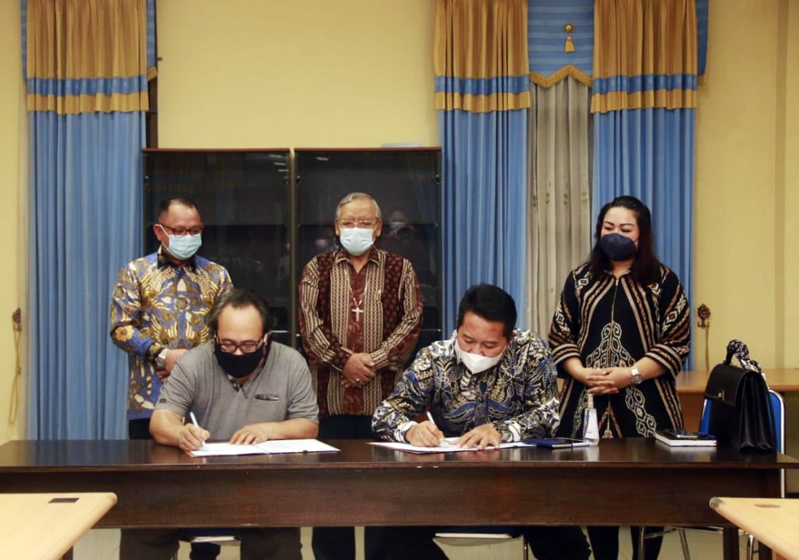 Penandatanganan MoU oleh Bupati Mahulu Bonifasius Belawan Geh, SH bersama Ketua Yayasan Kasih Sejati Kalimantan Pastor Wilfridus Samdirgawijaya, di ruang rapat Kantor Keuskupan Agung Samarinda. Dalam rangka mendukung pendirian Universitas Katolik Indonesia Satya Dharma di Provinsi Kaltim.