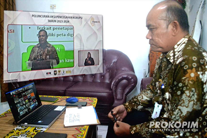 SAMARINDA – Bupati Mahakam Ulu ( Mahulu ) Bonifasius Belawan Geh, SH., ME yang diwakili Wabup Mahulu Drs. Yohanes Avun, M. Si mengikuti Acara Peluncuran Aksi Pencegahan Korupsi Tahun 2023 – 2024 yang digelar Strategi Nasional Pencegahan Korupsi (Stranas PK) secara daring, di Kediaman Pribadi Wabup Perum Karpotek Blok FF No. 1, Sungai Kunjang Samarinda. Selasa (20/12/ 2022)