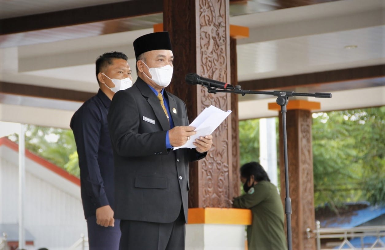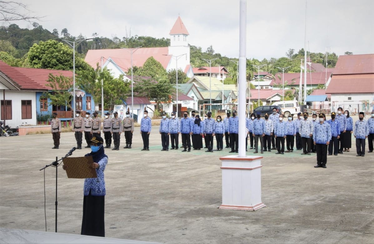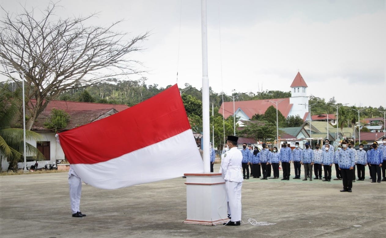 Upacara yang dimulai sejak pukul 08.00 tersebut berlangsung dengan penuh khidmat, dilaksanakan secara terbatas dengan menerapkan Protokol Kesehatan secara ketat, turut dihadiri Wakil Ketua I Tiopilus Hanye, S.AB,M.Si, Asisten Bidang Pemerintahan dan Kesra (Asisten I) Ir. Dodit Agus Riyono, MP, dan Sejumlah Kepala Organisasi Perangkat Daerah (OPD) di lingkungan Pemkab Mahulu.