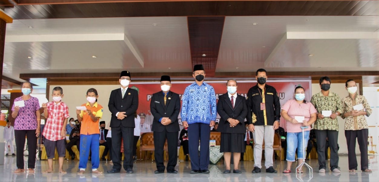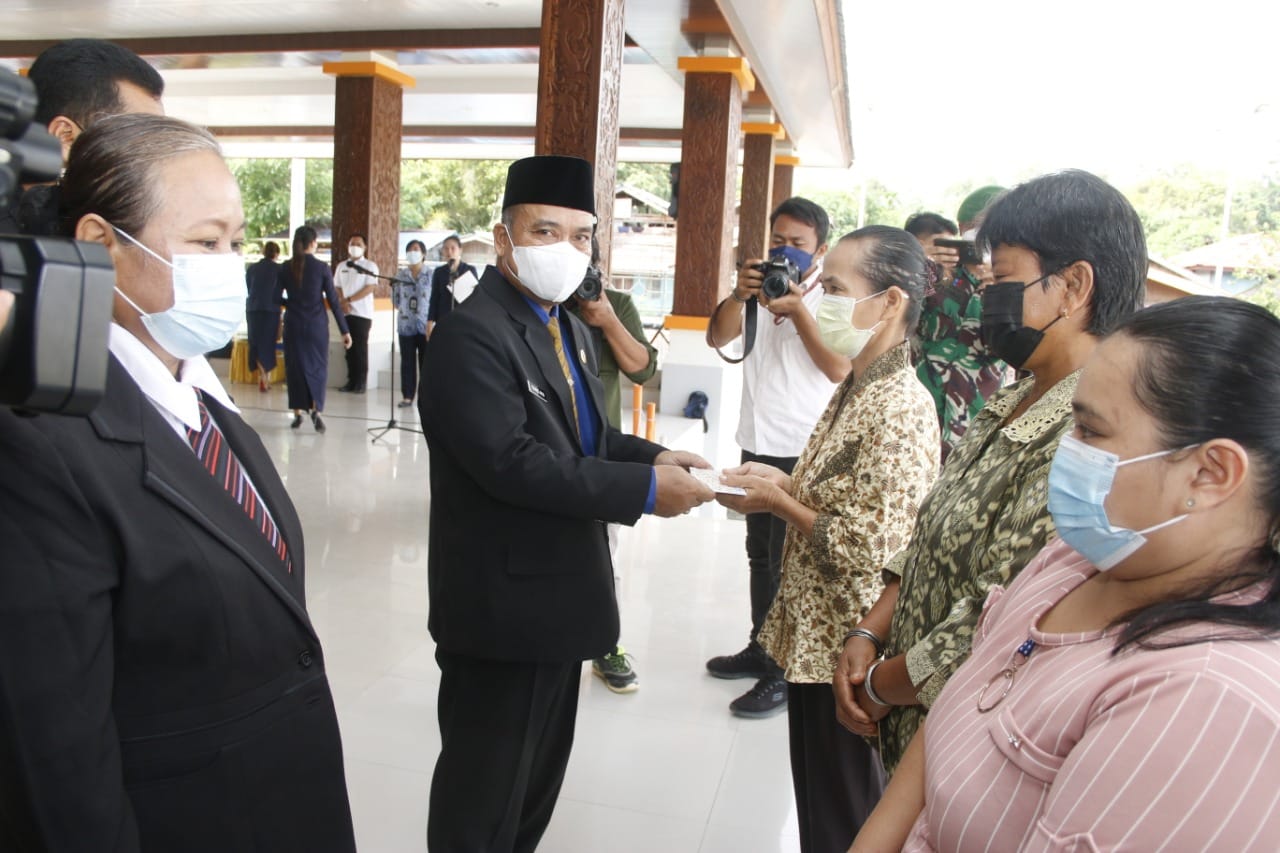 Usai upacara peringatan Hari Pahlawan ke 76, Wabup Drs. Yohanes Avun, M.Si secara simbolis menyerahkan santunan sosial berupa buku tabungan kepada masyarakat lanjut usia. (HMS/len/td).